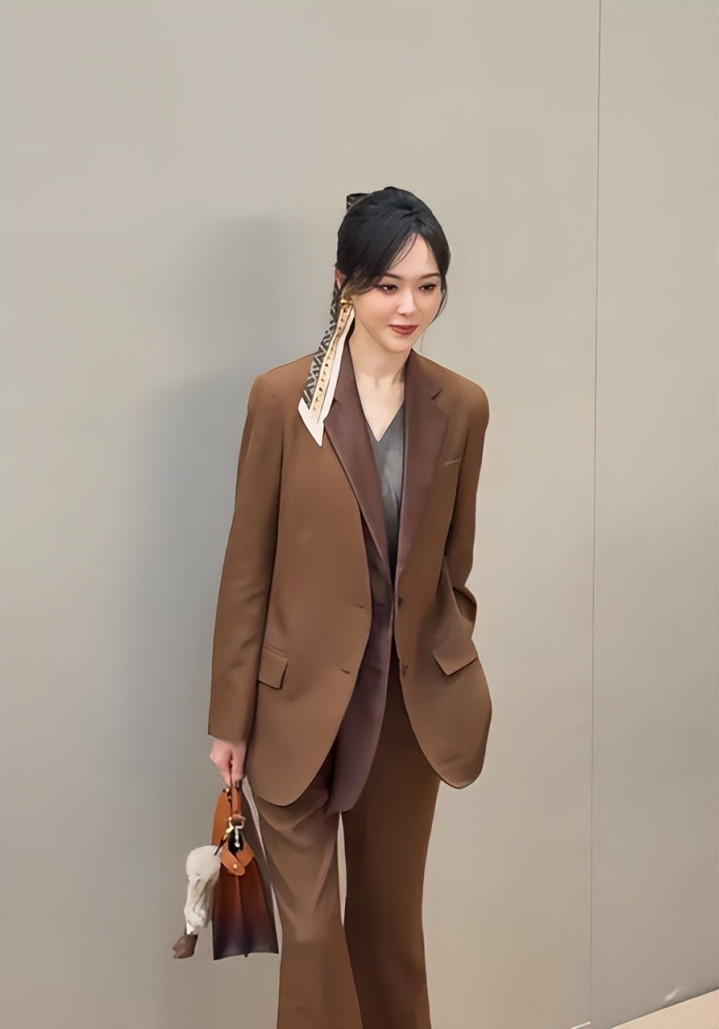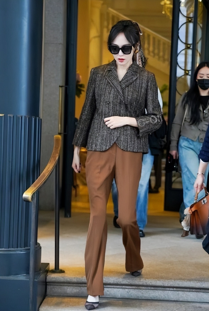 七分袖的西装短外套+深棕色的喇叭裤+网纱高跟鞋,简直是从头土到脚,连她都驾驭不了如此有“奶奶味”的衣服。