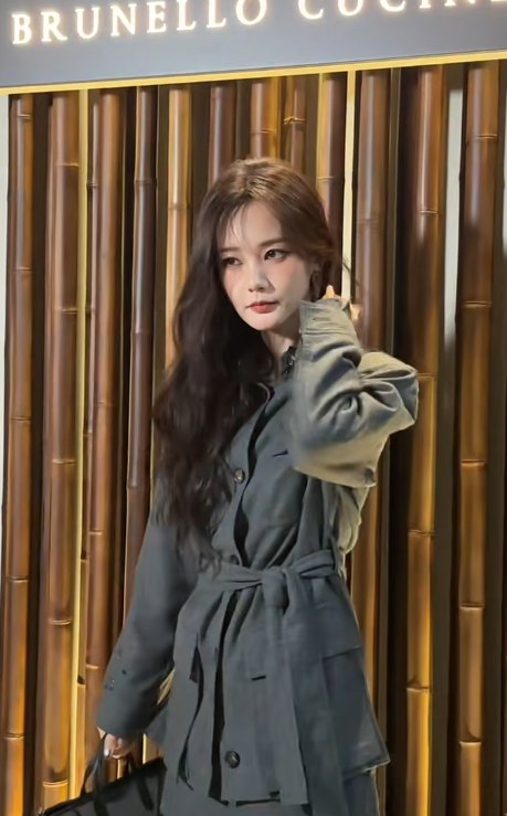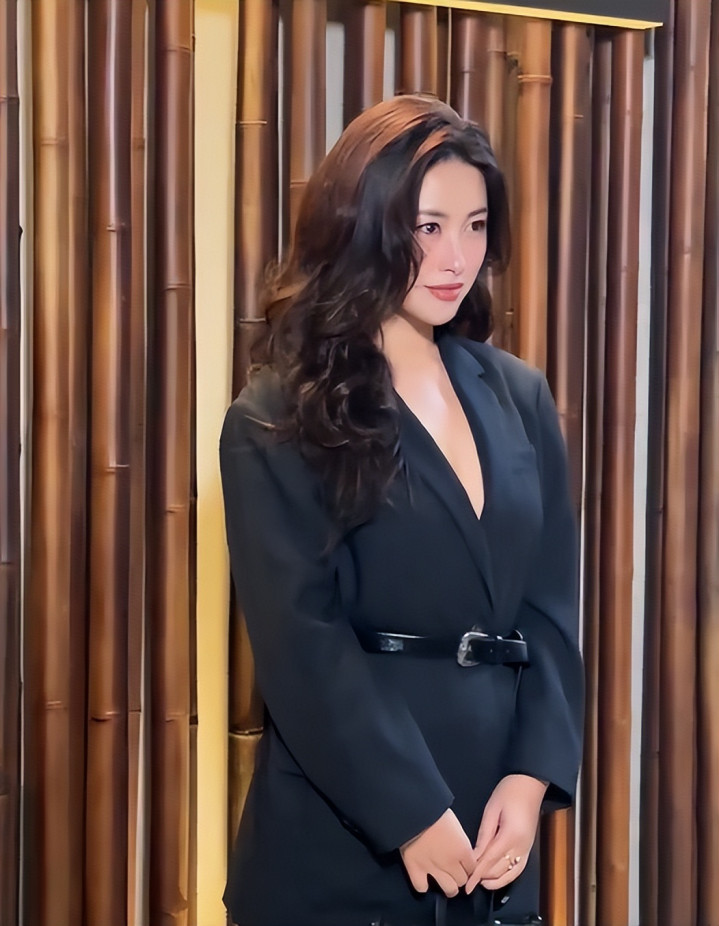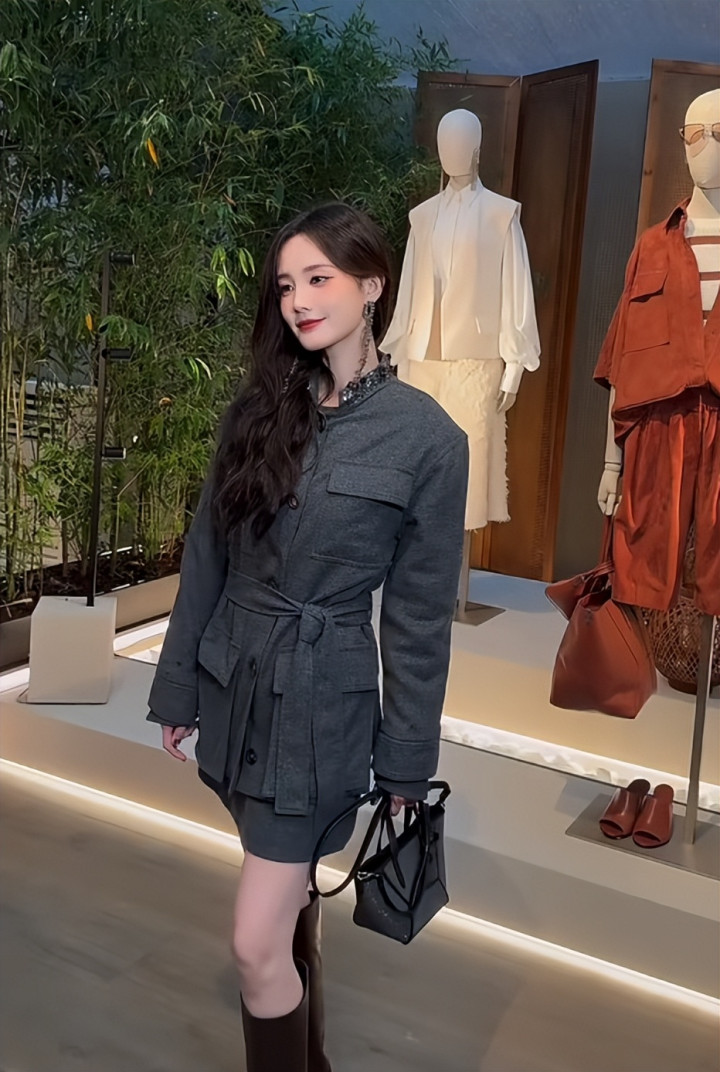 这次活动现场,她身穿深灰套装搭配长靴,微卷的长发随性地披散在肩膀上,飒爽中还带着些甜美的感觉。