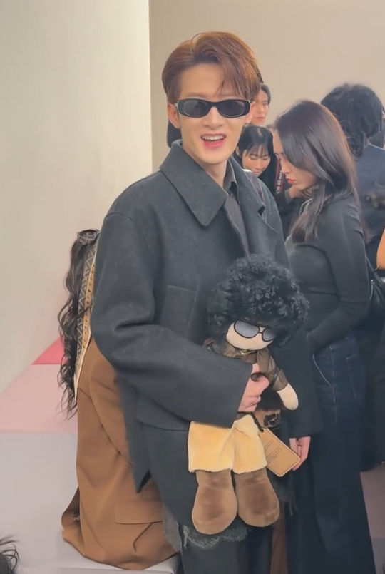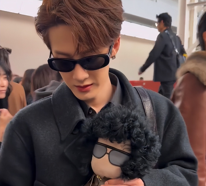 这是因为檀健次身穿正常的黑色毛呢外套,然而手中却抱着一个可爱的玩偶小人,冲淡了秀场的沉闷感,也让整体造型活泼了不少。