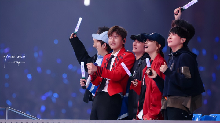 三人并肩坐在观众席,全程跟唱张杰的每首歌,手里的荧光棒挥个不停,跟普通歌迷没两样。