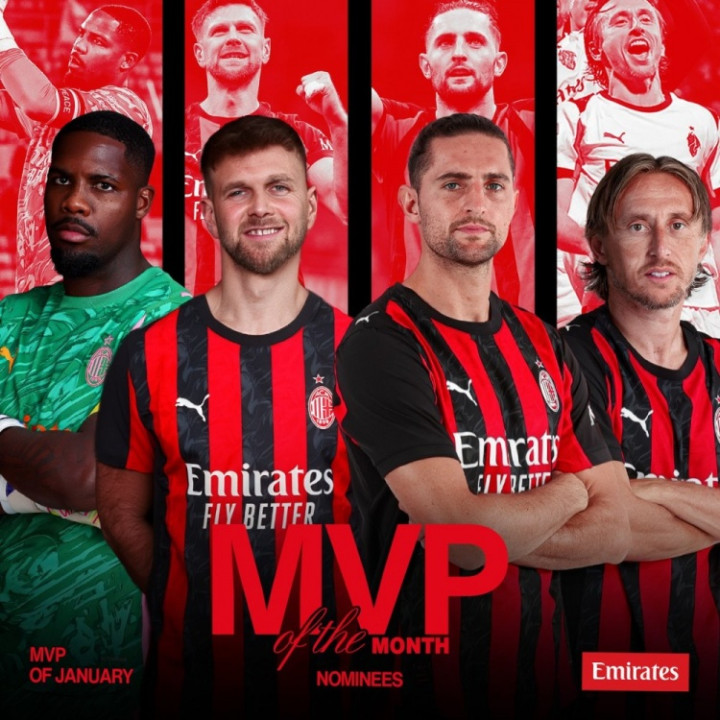 直播吧1月28日讯米兰官方公布了1月队内最佳球员的候选名单,迈尼昂、菲尔克鲁格、拉比奥特、莫德里奇在列。