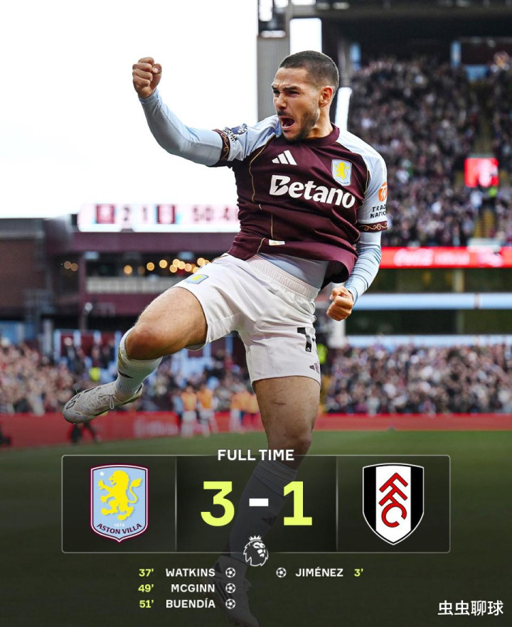 仅仅过了2分钟,刚刚替补登场的布恩迪亚抓住机会,在禁区中路劲射破门,将比分扩大为3-1!3分钟连进两球,主场球迷陷入狂欢,这一刻等了近一个月啊,终于有一场球打入3球啦,看来首胜有戏啦。随后富勒姆玩命反扑,但是面对士气正旺的维拉,外加上大马丁横刀立马在那,最终只能接受1-3败北,目送维拉收获联赛首胜。各项赛事2连胜,这也让埃梅里的执教压力暂时缓解。